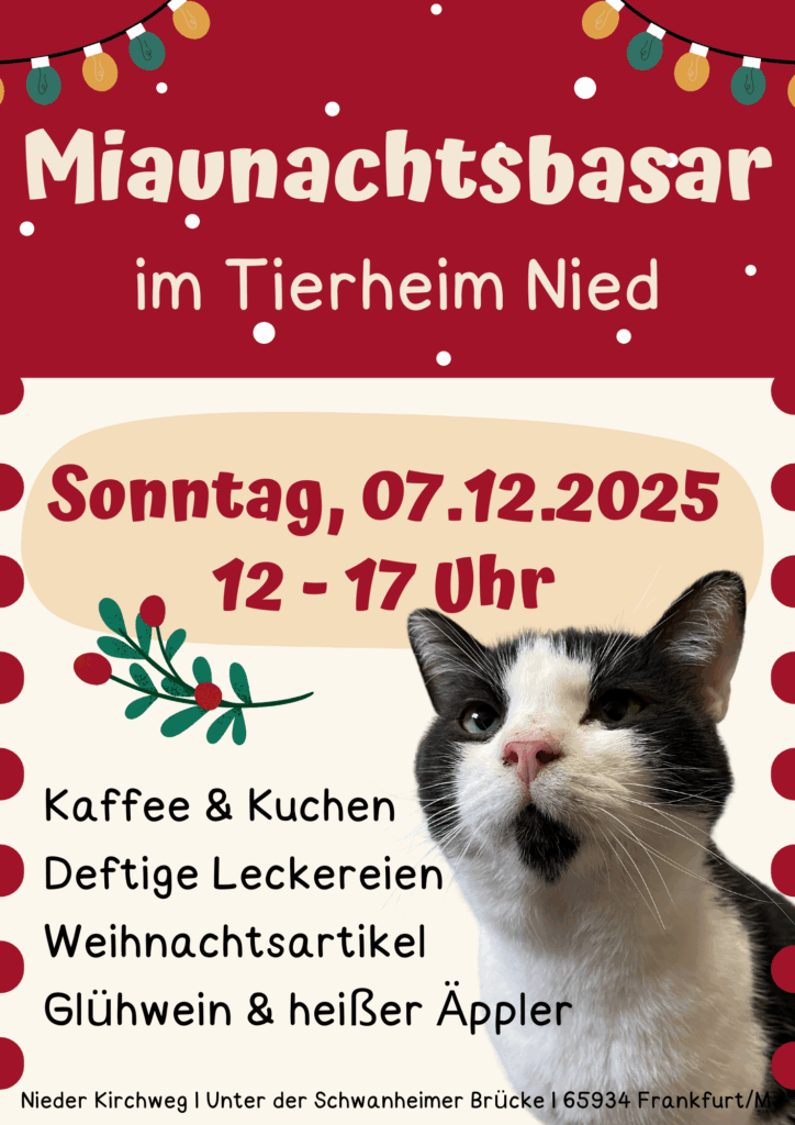 Hallo liebe Tierfreunde und Tierfreundinnen, es ist wieder soweit und die Vorweihnachtszeit rückt näher. Schon jetzt freuen wir uns darauf, Euch am Sonntag, den 07.12.2025 von 12.00 Uhr – 17.00 Uhr zu unserem jährlichen Miaunachtsbasar begrüßen zu dürfen.