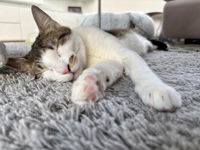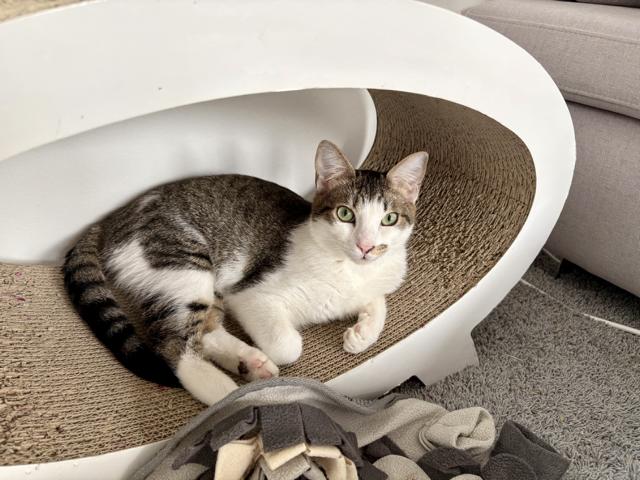 Aber schon nach einer Weile habe ich gemerkt, dass hier alle nett sind und mir nichts passiert. Seitdem mache ich jeden Tag neue Schritte nach vorne und bin mittlerweile mittendrin im Familienleben. Ich liebe dieses Gefühl, dazuzugehören, schaue neugierig zu, was meine Menschen machen, und begleite sie sehr gerne durch die ganze Wohnung. Eigentlich möchte ich immer wissen, was gerade passiert und dabei laufe ich gerne zwischen den Beinen durch, was mich zu einer kleinen, aber sehr charmanten Stolperfalle macht. Ich habe auch gelernt, mein Futter lautstark einzufordern. Das habe ich mir bei den älteren Katzen in der Familie abgeguckt – und ich finde, ich mache das schon ziemlich gut! Kuscheln mag ich mittlerweile auch gerne. Am liebsten lasse ich mich unter dem Kinn kraulen – da fange ich sofort an zu schnurren. Ich suche gerne Nähe, aber in meinem eigenen Tempo. Nur eines empfinde ich noch als ein bisschen unheimlich: Hochgehoben werden. Da brauche ich noch etwas Zeit, um zu lernen, dass auch das nichts Schlimmes ist.